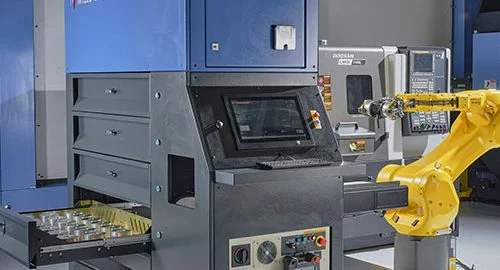 All systems feature a Fanuc industrial robot, a five (two-way) drawer system for part loading/unloading and a 17” touchscreen with onboard SYNERGi software.