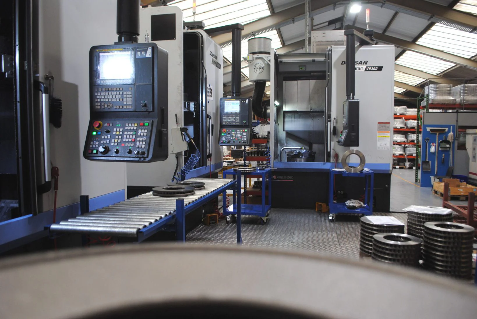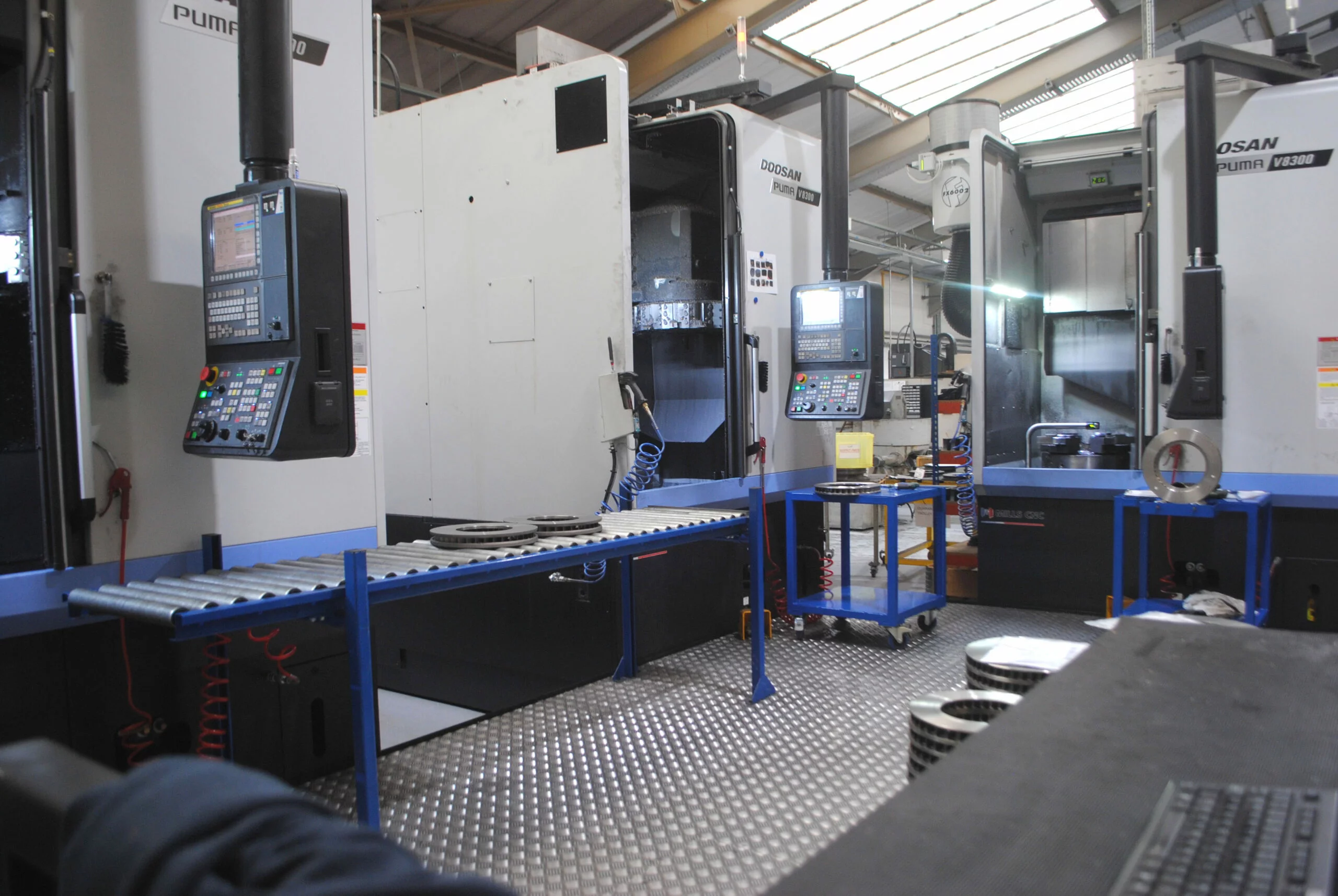 The V8300 lathes at Alcon are positioned in close proximity to each other enabling rapid part transfer between them, and are being used to machine a range of different sized brake discs.