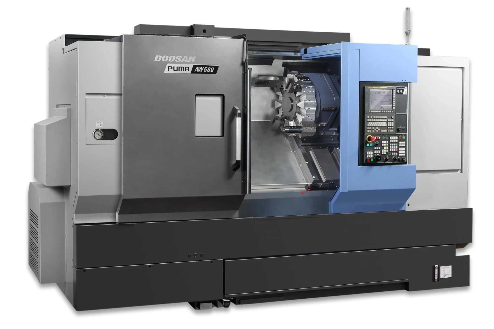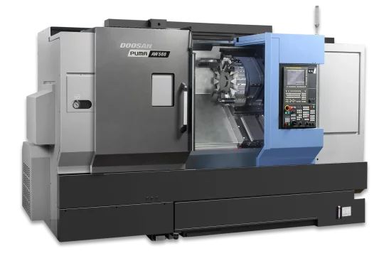 - Doosan AW II series – equipped with powerful spindles (up to 37kW/3,000rpm) guaranteeing high stock removal, a fast indexing turret (12-station) and a high-pressure, high-volume coolant system that removes heat from the tool and workpiece ensuring high accuracy, superior finishes and longer tool life