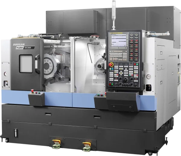 Doosan’s high-productivity twin-spindle chucking lathe range is available in two different sizes – the 8” chuck TW 2100 and 10” chuck TW 2600 series (6″ and 12″ options available). The machines are equipped with high torque spindles and servo-driven turrets.