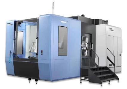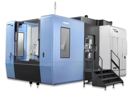 The DHF 8000 is a 5-axis simultaneous twin pallet horizontal machining centre with high rigidity structure and dual ball screws on the X and Y axes.