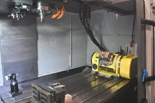 The machine was specified with i) a Nikken 5th-axis unit (rotary tilting table) enabling it to be used for 3 + 2, 4 + 1 and simultaneous 5-axis machining, ii) a Renishaw OMP60 and OTS tool and workpiece probe package for quick and trouble-free in-process inspection and measurements, iii) a MH500 swarf conveyor for high-efficiency chip evacuation – especially useful during intense and long machining runs.