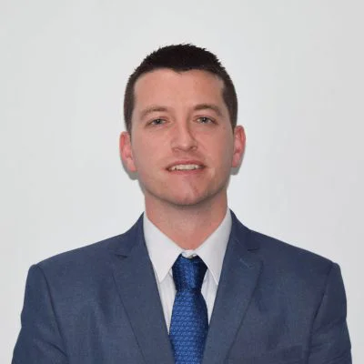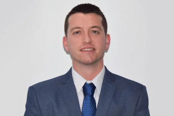 Martyn Jones in suit smiling at camera in front of white backdrop