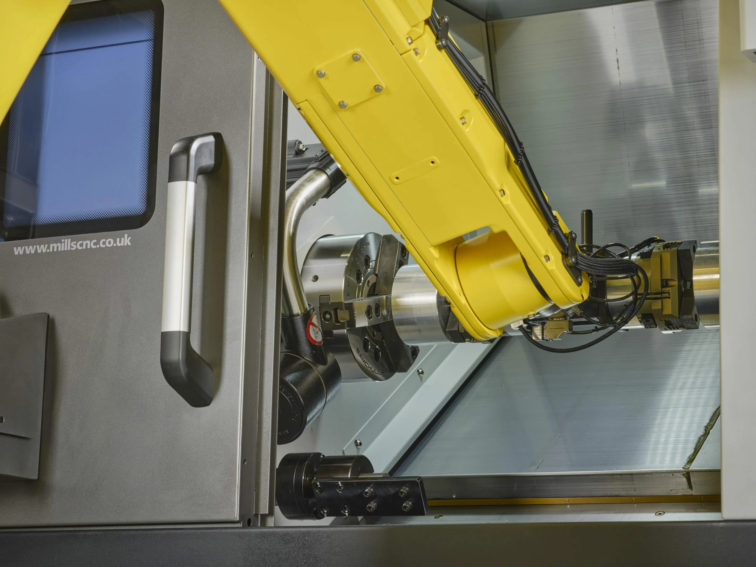 The cell, which comprises a compact 8″chuck/65mm bar diameter DN Solutions Lynx 2100LSYB sub-spindle turning centre, with driven tools and Y-axis capabilities, a Fanuc (6-axis) industrial robot with a 25kg payload and end-of-arm tooling, a SYNERGi Premier 5-drawer (two-way) part loading/unloading station and a 17″ touchscreen iHMI, will demonstrate the significant productivity and process efficiency gains component manufacturers can expect to achieve from investing in a tried, tested and trusted automation solution from Mills CNC.