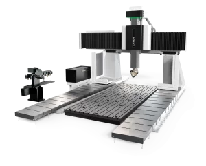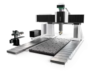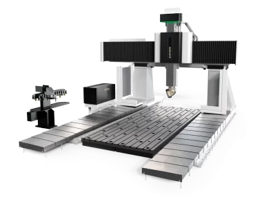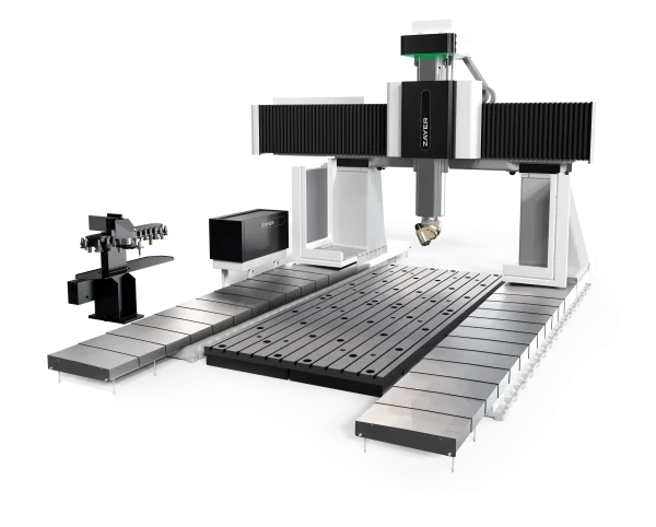 Gantry-type milling machine with moving bridge, fixed table and fixed cross beam.