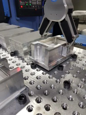Once machining operations have been completed the cobot takes the finished (machined) component from the machine and places it back on the peg board in its predetermined position. This cycle is then repeated, with no operator intervention, until all the parts have been machined.