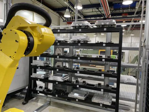 The 24 pallets in Linn’s SYNERGi cell reside on a racking system located inside the caged area adjacent to the DVF 5000 and the Fanuc robot.