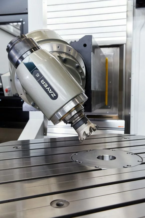 Although being showcased with a 45-degree head (360,000 positions), the machine can be supplied with different head configurations (i.e. 30-degree head or an electro-spindle 33kW/18,000rpm option) and a range of software apps (developed in-house by Zayer) to increase the machine’s potential and appeal.